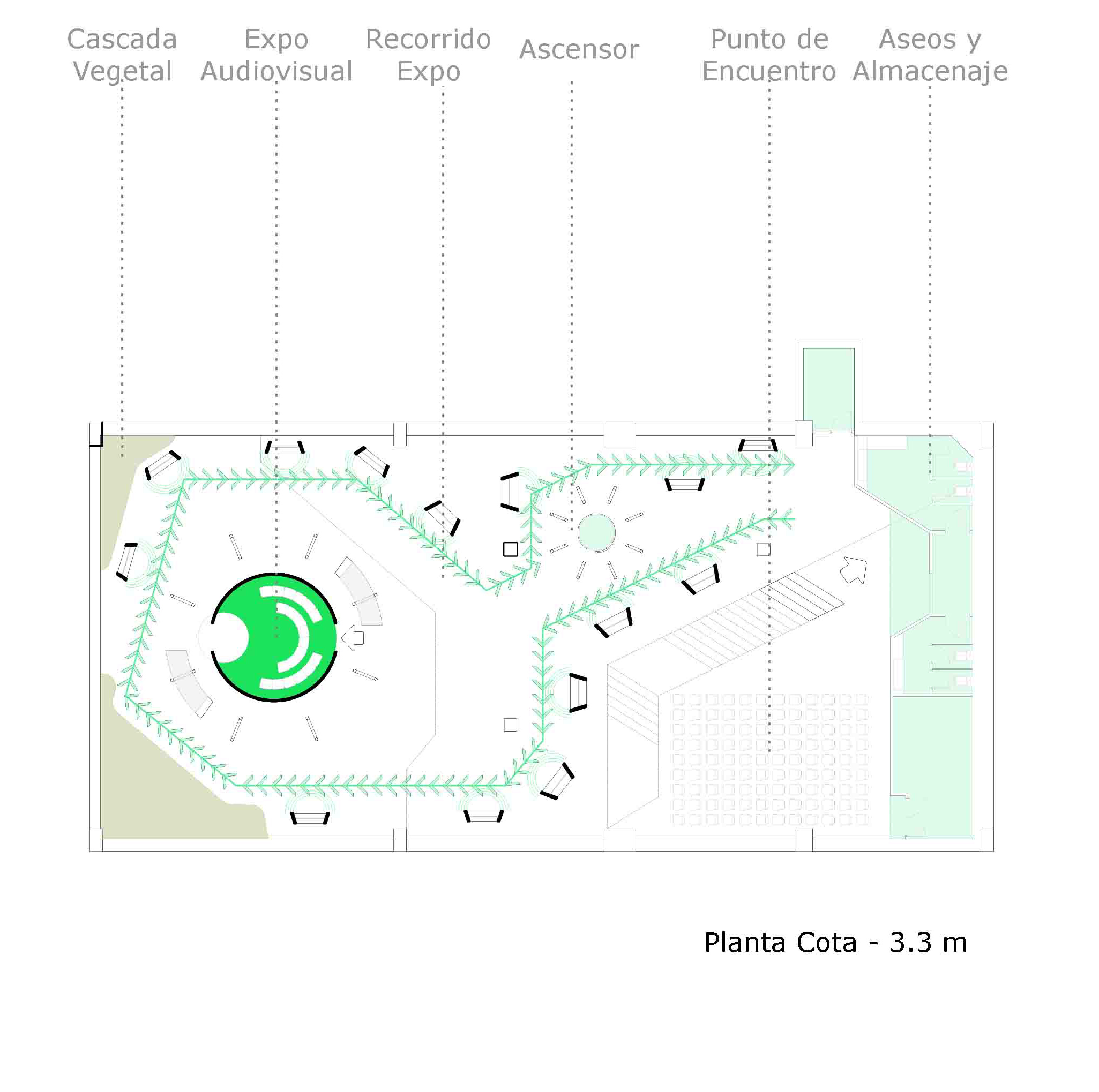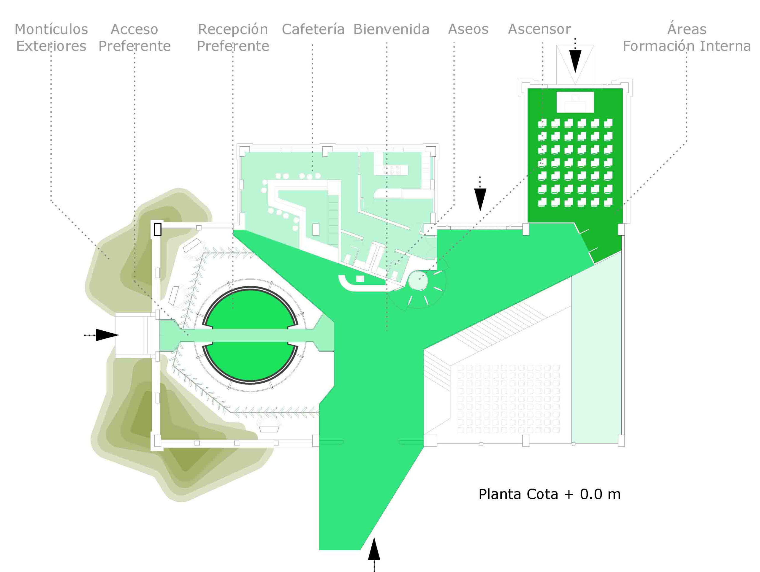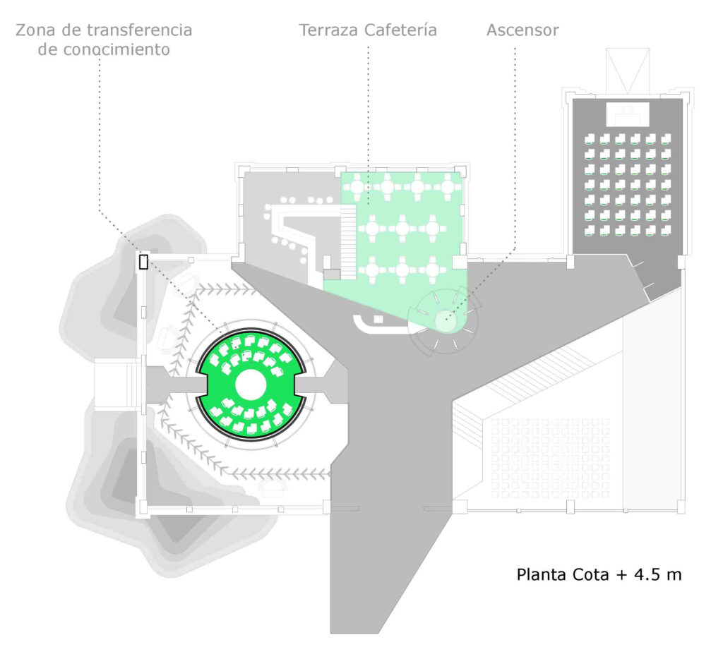 Estas dobles alturas son las que permiten la integración de elementos como las edificaciones interiores verticales (Ascensor y Espacio ‘Silo’). El espacio ‘Silo’ alberga las actividades que necesitando visibilidad, requieren mayor privacidad; por ello, intentando reflejar el entorno de la fábrica representando un depósito elevado, en la planta 0 da soporte a través de una pasarela al Acceso LAFARGE en la fachada suroeste, que acaba desembarcando en el forjado principal central y espacio de recepción/bienvenida.