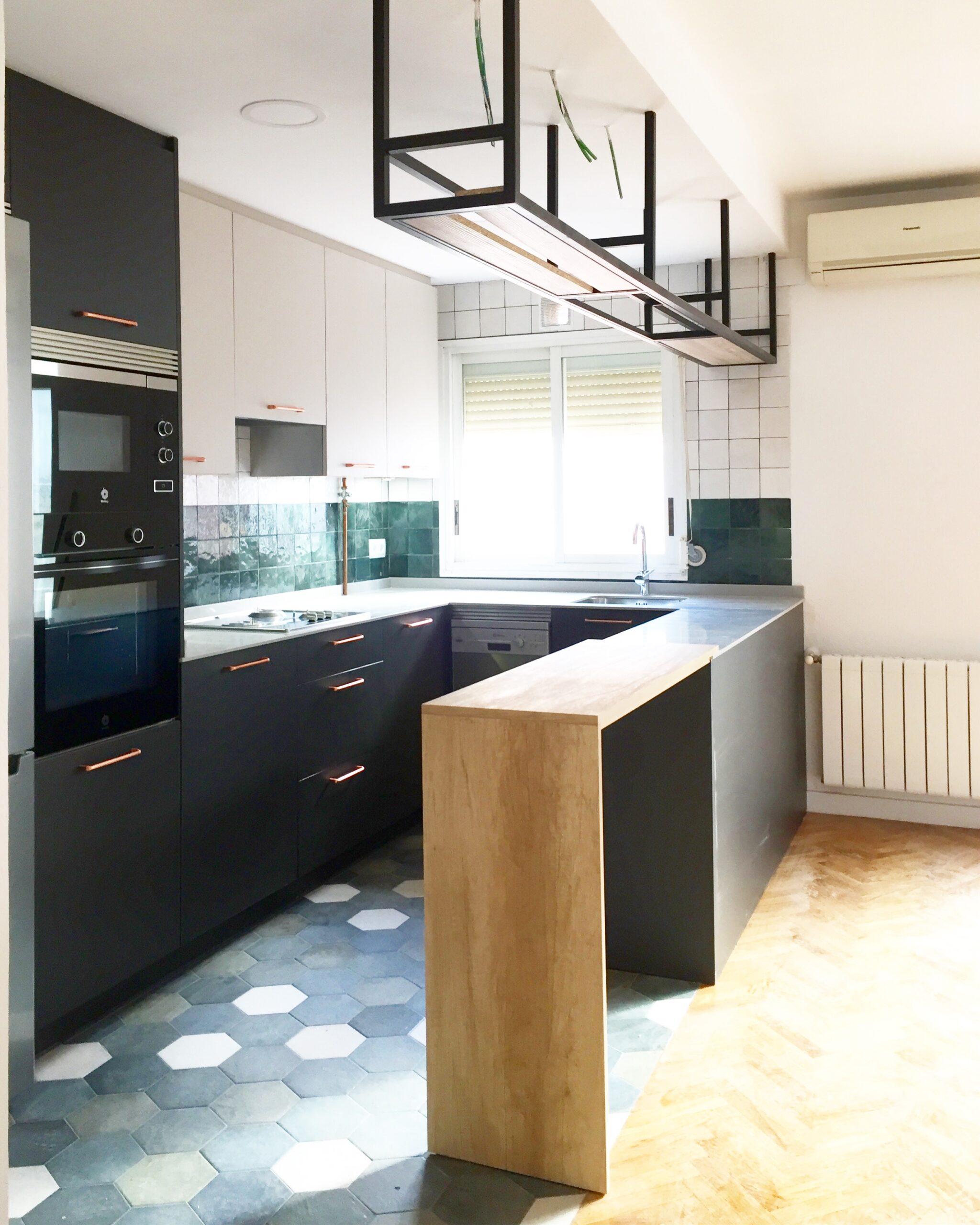 La cocina es el punto fuerte de este apartamento; una cocina abierta, funcional, muy moderna en color antracita y azulejos verdes. Sin embargo, tiene un punto cálido y muy acogedor por la combinación de madera y cobre. Trabajamos especialmente la textura del suelo con un mosaico de hexágonos en color verde musgo, azul océano y blanco; el suelo es aquí el plano más divertido.