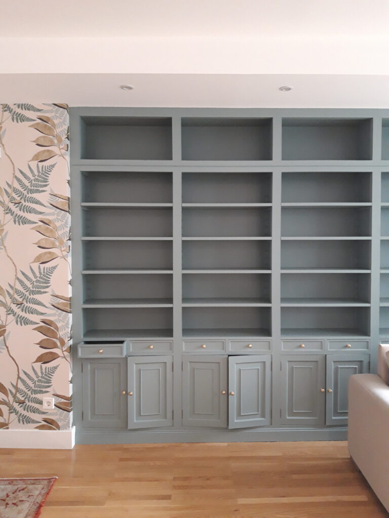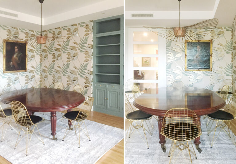Transformamos la gran librería a medida, que era de maderas oscura y mas baja, en el plano de fondo perfecto, aumentando su altura hasta el techo y lacándola en color Farrow&Ball ‘Oval Room Blue’. Junto a ella, para el entorno del comedor creamos un rincón ‘vegetal’ utilizando el papel ‘Feuille D’Or’ de Osborne&Little que se suaviza con un papel complementario que empleamos en el plano intermedio, incluida la columna central, con un acabado de textura que aporta el papel ‘Lucenta’ también de Osborne&Little.