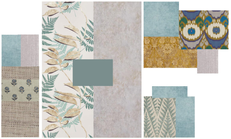 Trabajamos muy de cerca con ellos, analizando todas aquellas piezas que querían conservar y encontrando el marco perfecto para su disposición. El “moodboard” que diseñamos se centra en una paleta con abundancia de tonos verde agua -azulado- con matices de tono rosa empolvado y acentos dorados en otros elementos, que aportan calidez.