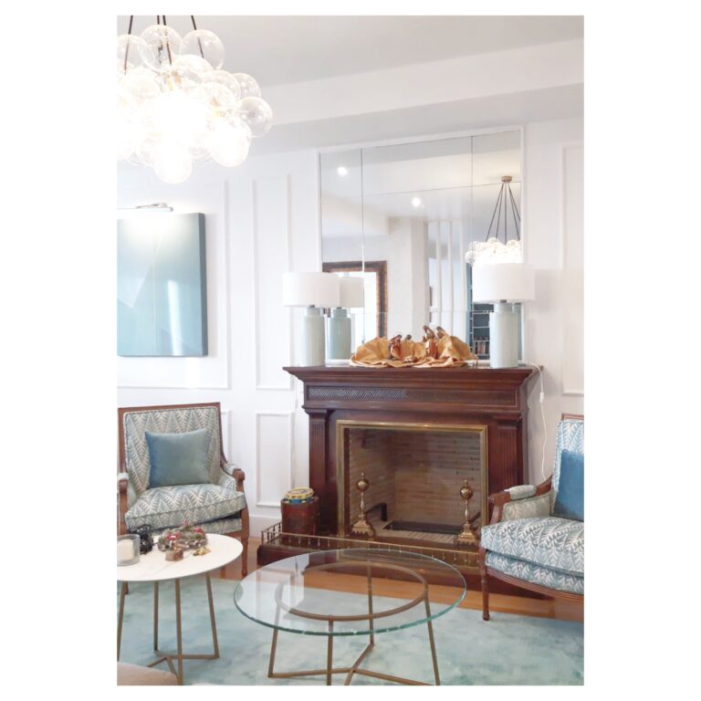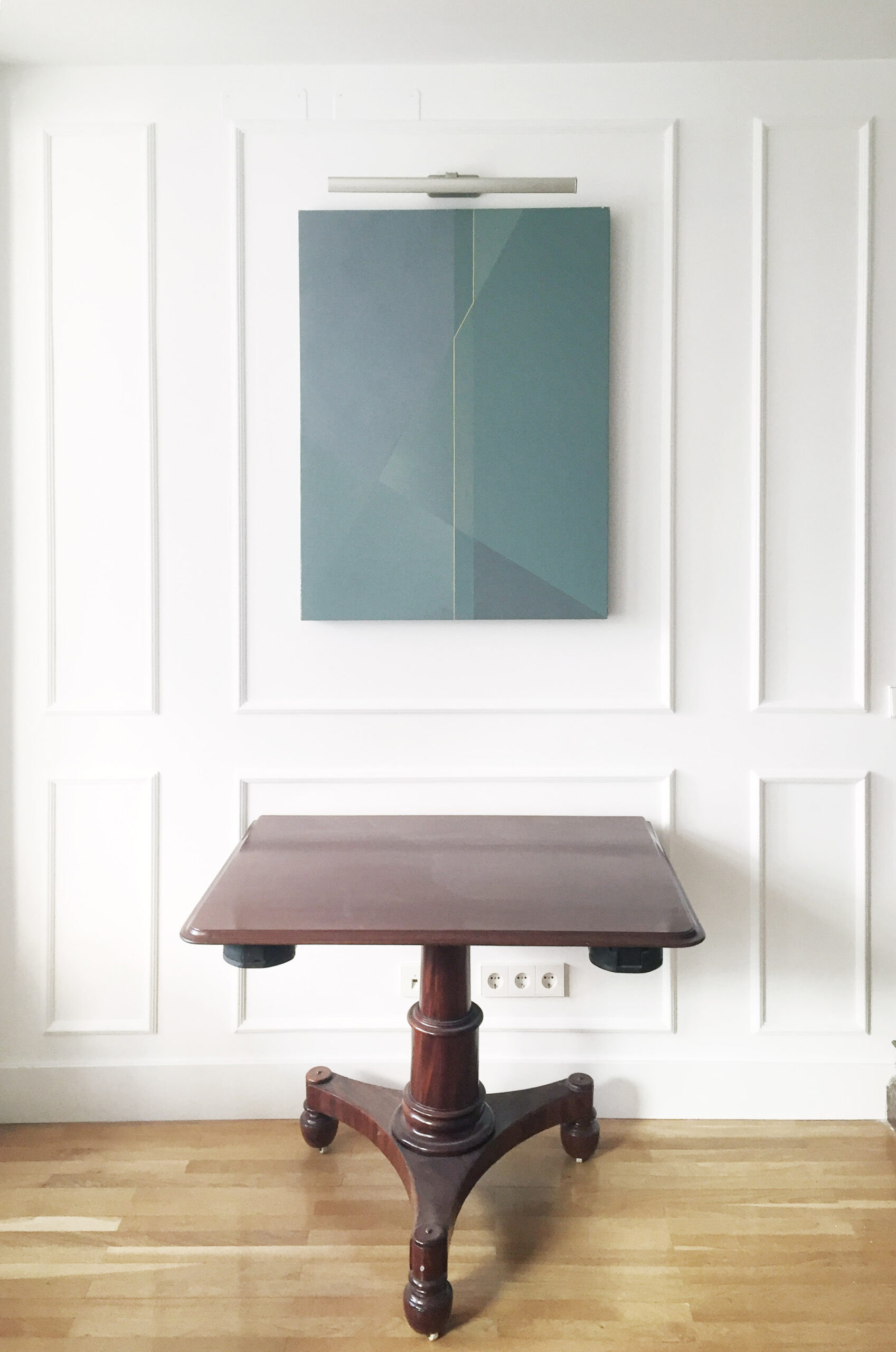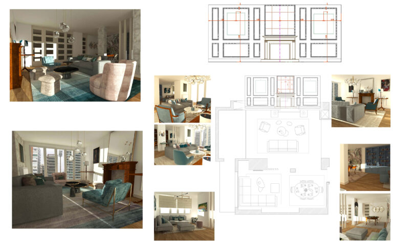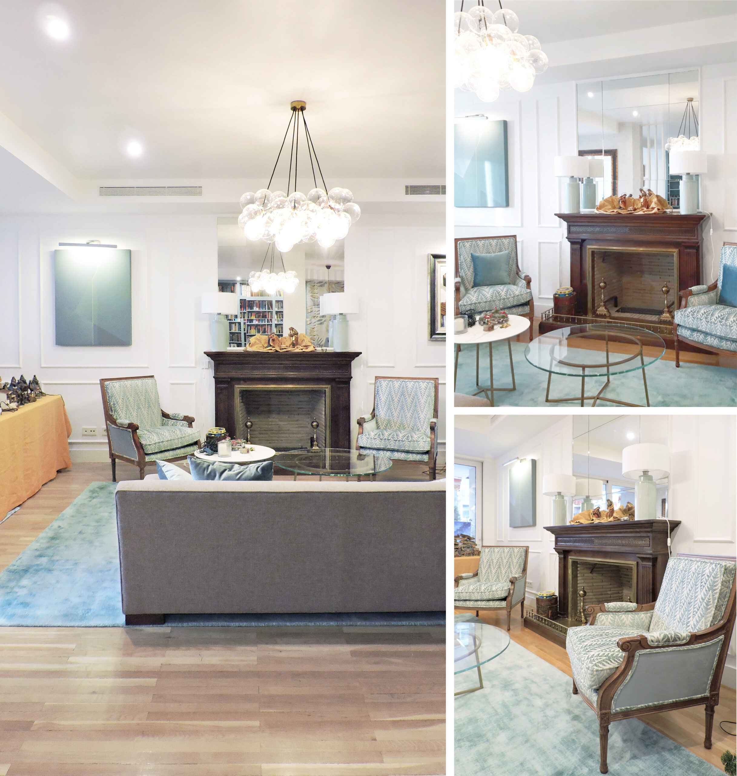 El espacio de salón formal estaba presidido por una chimenea con frente de madera oscura que conservamos, sin embargo había una clara desconexión entre este elemento tan clásico y la proporción del espacio y su acabado en pared lisa sin tratar. Decidimos crear un frente estructurado con cuadros y canales de escayola que permitiera estructurar una ‘fachada interior’, generando un efecto centrado para la chimenea y simétrico para las consolas laterales y los cuadros.
