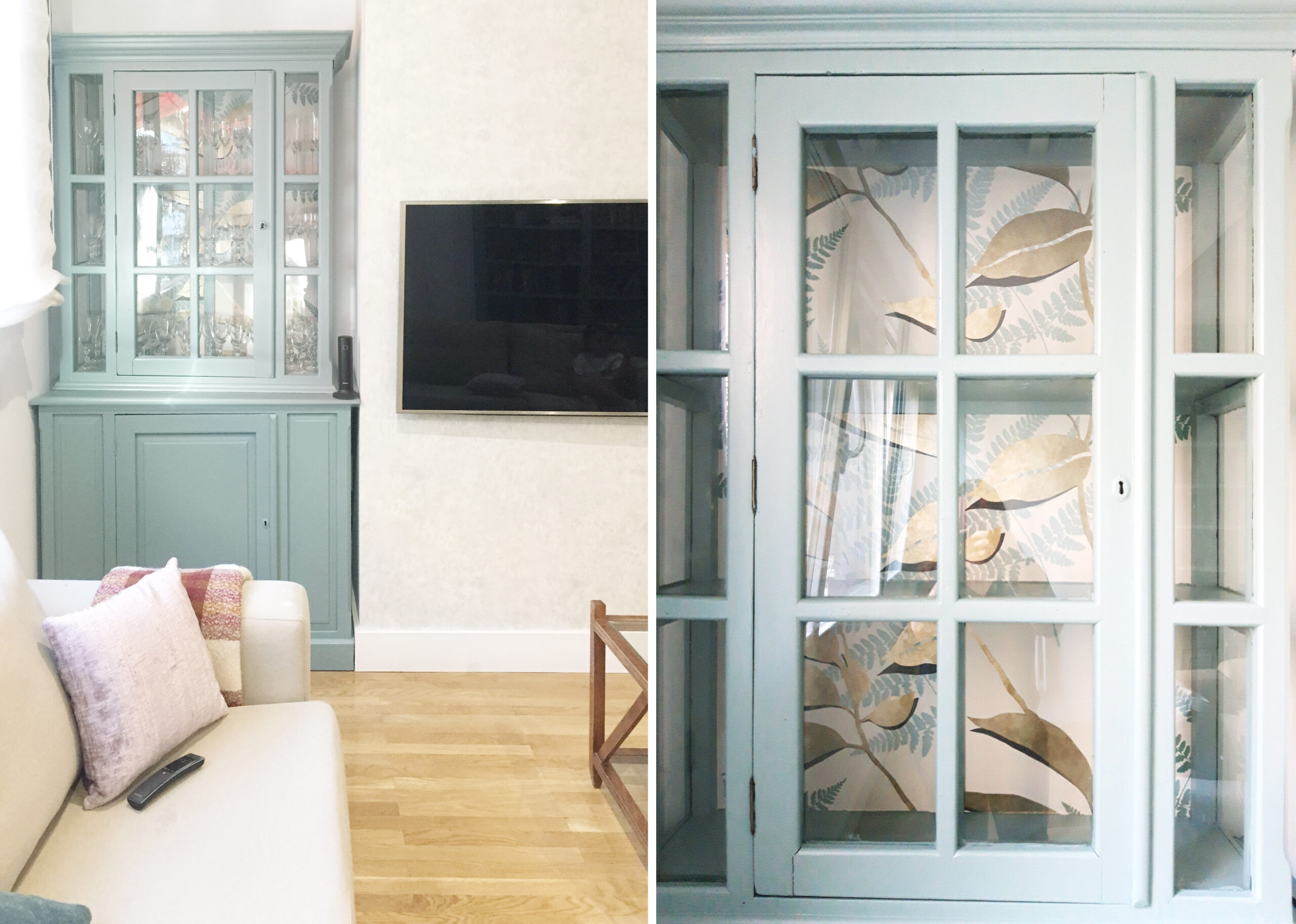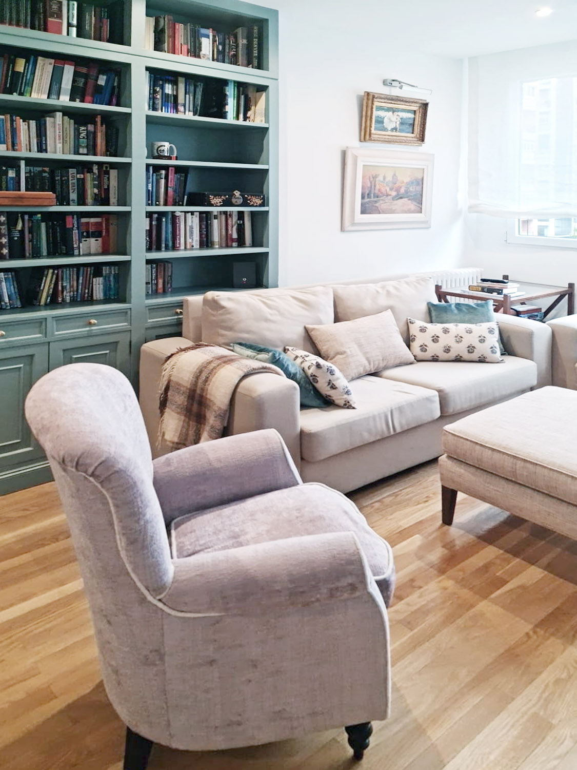 En la zona de descanso más privado, incorporamos un separador de lamas lacadas en blanco. Estor de lino a medida, y partiendo de los sofás en tono beige, diseñamos una otomana a medida con tela ‘Eldson’ de Osborne&Little, cojines con la misma tela y también otros en ‘Hindi Konkani’ de Güell Lamadrid. La vitrina, que anteriormente estaba en madera oscura y en otra ubicación, la reconvertimos en el mismo color que la librería y con el fondo de papel pintado a juego.